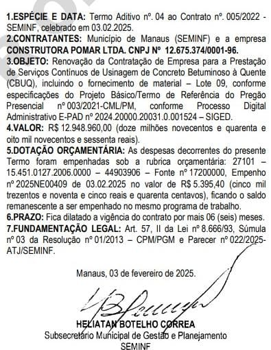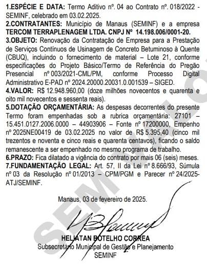 Além dessas contratações, a Secretaria Municipal de Infraestrutura (Seminf) já havia renovado, neste mês, acordos com as empresas Ardo Construtora, Iza Construções e Construtora Soma, que também acumulam valores expressivos na atual administração.