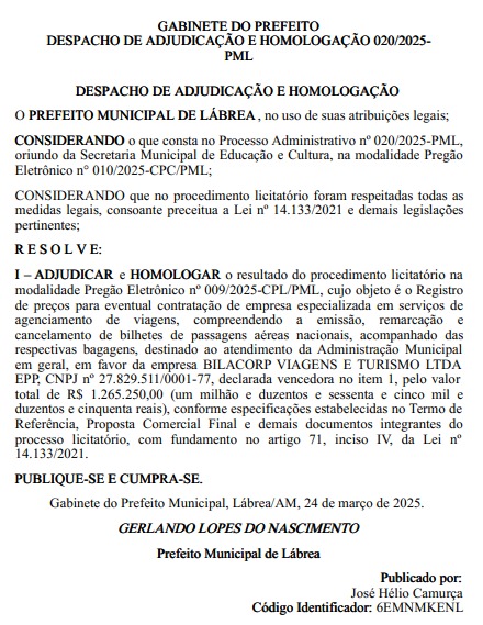 O prefeito de Lábrea, Gerlando Lopes, vai desembolsar mais de R$ 1,2 milhão para contratar uma agência de viagens. O despacho de Adjudicação e Homologação foi assinado na segunda-feira (24) e publicado no diário da Associação Amazonense de Municípios (AAM).