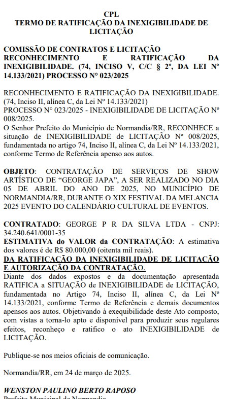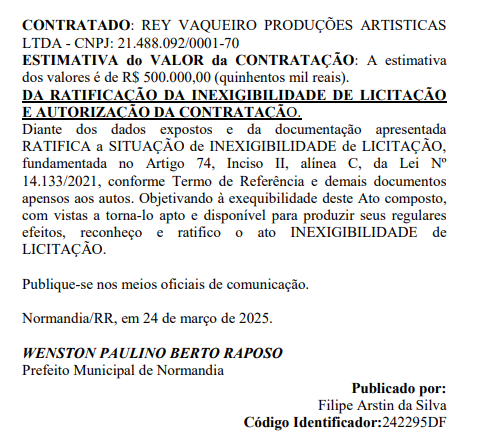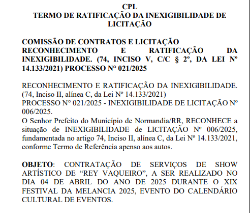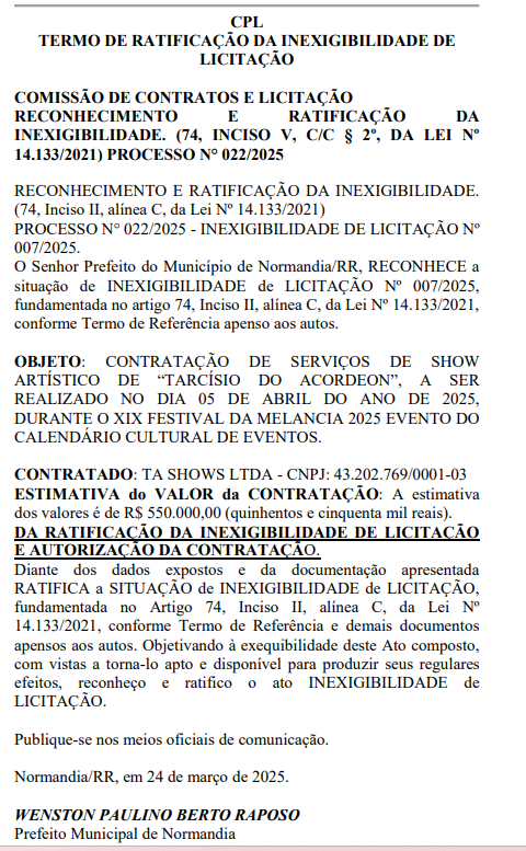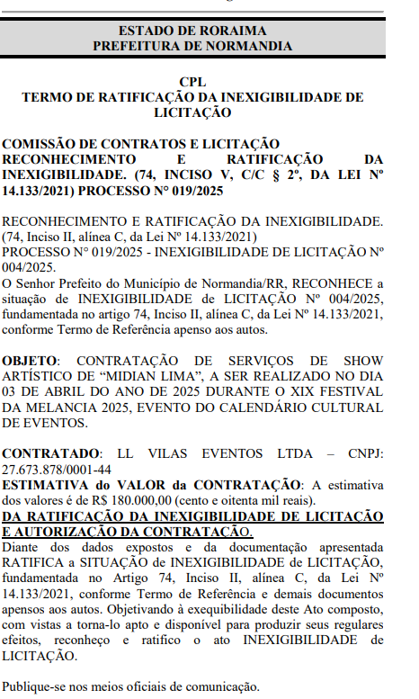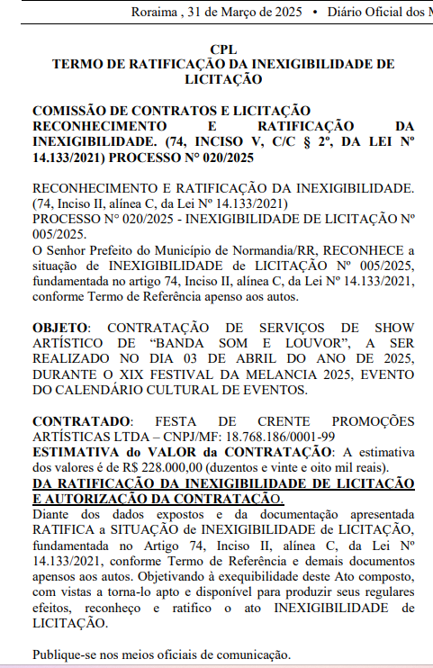 O prefeito de Normandia, Dr. Raposo (PP), autorizou a contratação de cinco atrações musicais para o XIX Festival da Melancia, que acontecerá de 3 a 5 de abril, com um custo total de R$ 1.718.000. Todas as contratações foram realizadas por inexigibilidade de licitação e publicadas no Diário Oficial dos Municípios de Roraima (DOM-RR) nesta segunda-feira (31).