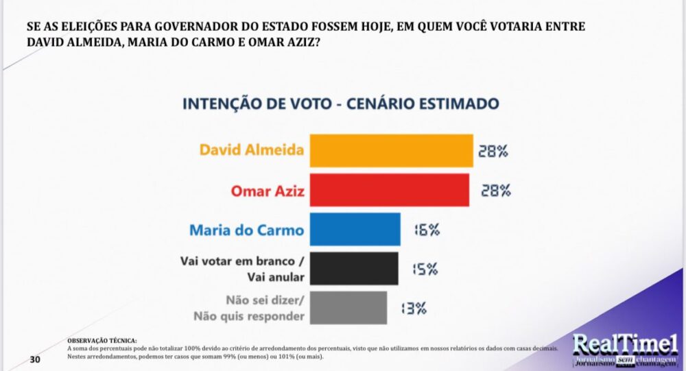 A pesquisa RealTime1 considerou amostra de 1.500 eleitores e metodologia por cotas baseada em dados do IBGE e TSE e também traz intenções de voto para o Senado e a Presidência da República, além da avaliação da imagem do prefeito David Almeida que, segundo a amostra, tem sua gestão desaprovada por 39% dos manauaras, além de uma avaliação negativa de 53% dos entrevistados.