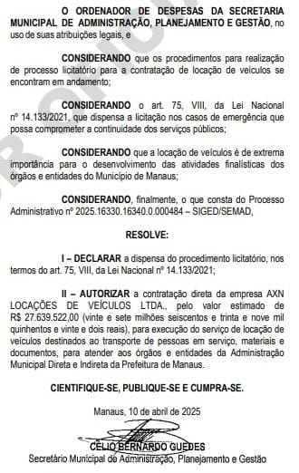A Prefeitura de Manaus, utilizando a Lei de Calamidade Pública como justificativa, dispensou licitações e autorizou a contratação direta de duas empresas para prestação de serviços de transporte, totalizando um valor estimado de R$ 49,3 milhões. As decisões foram publicadas no Diário Oficial do Município (DOM) nessa sexta-feira (11).