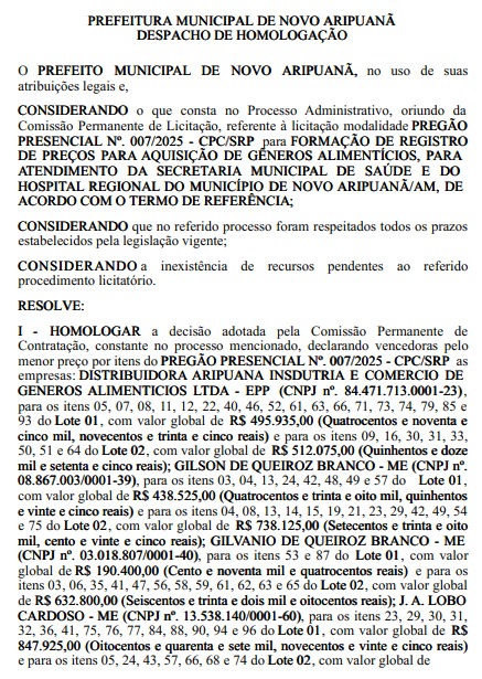 A Prefeitura de Novo Aripuanã, no sul do Amazonas, homologou contratos que totalizam mais de R$ 3,1 milhões para a aquisição de gêneros alimentícios destinados à Secretaria Municipal de Saúde e ao Hospital Regional do município. A decisão consta no despacho publicado no último dia 12 de março e é resultado do Pregão Presencial nº 007/2025 – CPC/SRP.