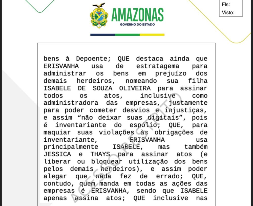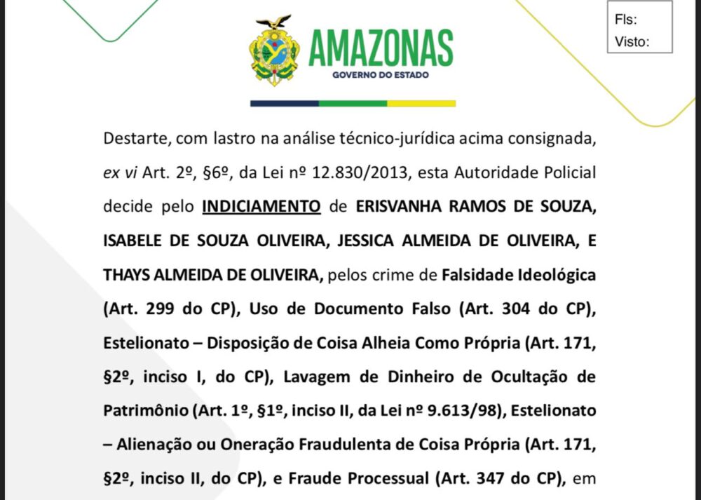 Um inquérito da Polícia Civil do Amazonas (PC-AM), assinado em março deste ano, investiga a atuação de um grupo de mulheres ligadas ao Grupo Chibatão em supostos esquemas de desvio de bens, fraudes documentais e ocultação de patrimônio. Entre os nomes citados na investigação estão a advogada Erisvanha Ramos, sua filha, a empresária Isabele Simões de Oliveira, além da arquiteta Jéssica de Almeida Oliveira e da estudante de medicina Thays Oliveira.