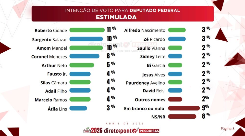 Além de ser lembrado como possível candidato a deputado federal, Menezes também foi citado na pesquisa estimulada para o governo do Amazonas, publicada anteriormente pelo instituto Direto ao Ponto, com 13% das intenções de voto, consolidando-se como uma das principais apostas do Progressistas para 2026.
