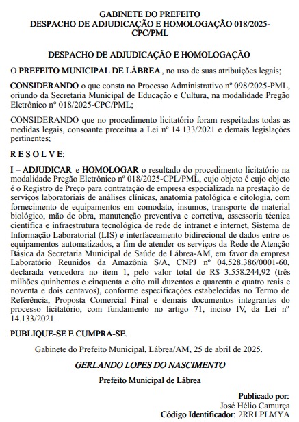 A Prefeitura Municipal de Lábrea homologou nesta sexta-feira (25), o resultado do Pregão Eletrônico nº 018/2025-CPL/PML, que resultou na contratação de uma empresa especializada na realização de exames laboratoriais clínicos e anatomopatológicos. O valor total do contrato é de R$ 3.558.244,92.