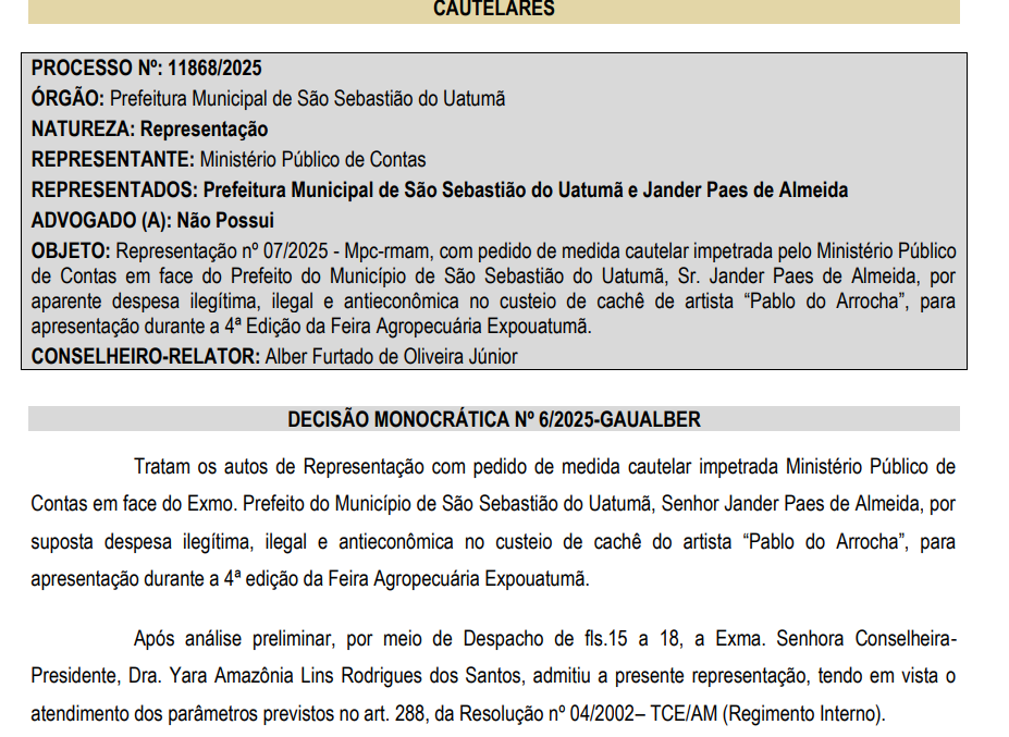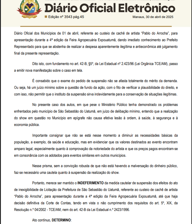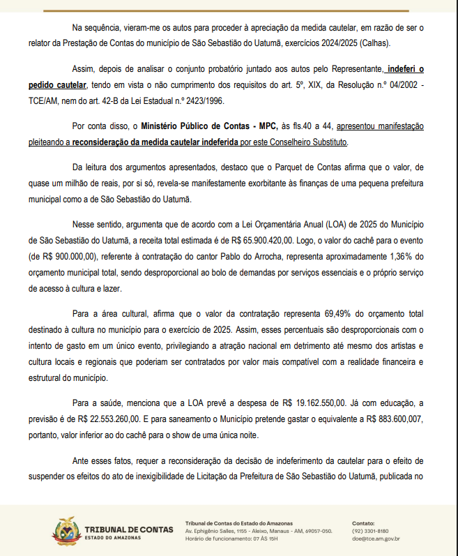 O pedido de medida cautelar para suspender o pagamento foi negado pelo conselheiro-relator do Tribunal de Contas do Estado do Amazonas (TCE-AM), Alber Furtado de Oliveira Júnior, que considerou não haver elementos suficientes para justificar a suspensão imediata do show. A decisão foi publicada na edição nº 3543 do Diário Oficial dos Municípios.