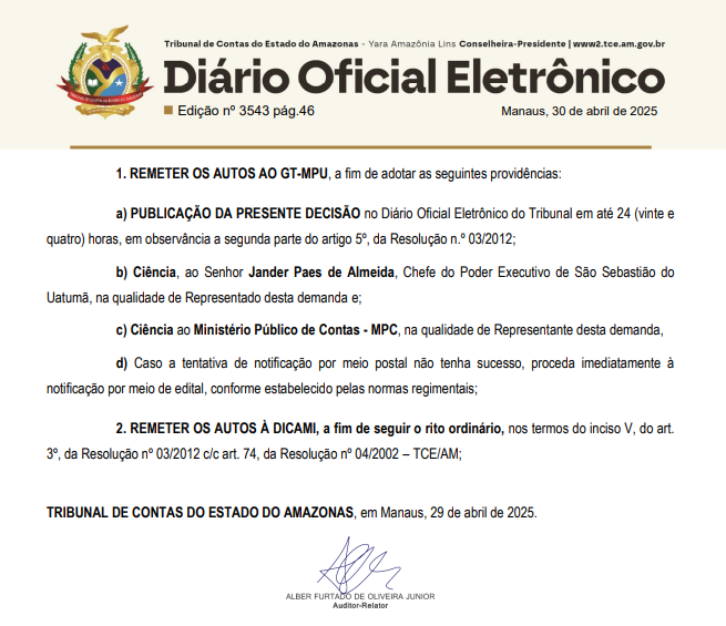 A representação seguirá agora o rito ordinário no TCE-AM, que poderá julgar o mérito da questão em decisão definitiva. O prefeito Jander Paes de Almeida e o Ministério Público de Contas serão notificados formalmente sobre os próximos passos do processo.