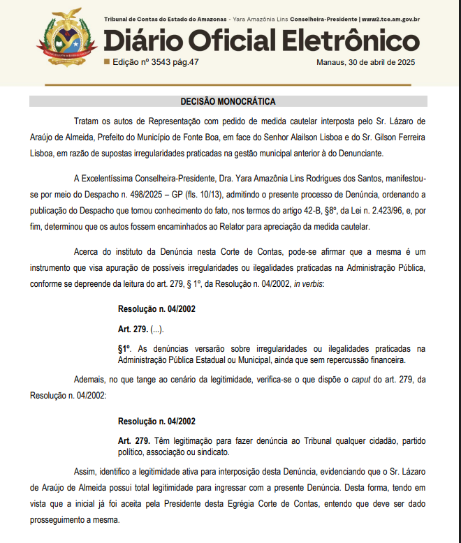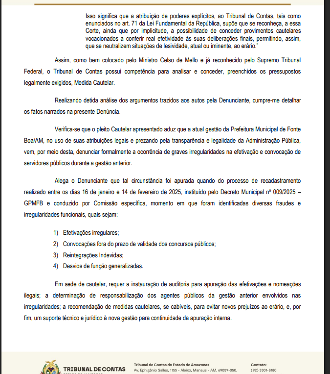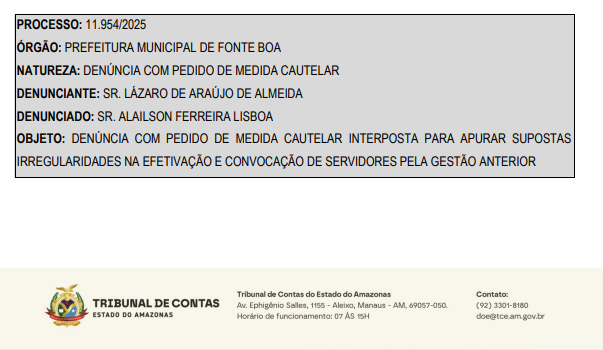 O Tribunal de Contas do Estado do Amazonas (TCE-AM) recebeu uma denúncia com pedido de medida cautelar protocolada pelo atual prefeito de Fonte Boa, Lázaro de Araújo de Almeida, contra os ex-gestores municipais Alailson Ferreira Lisboa e Gilson Ferreira Lisboa. A denúncia, registrada sob o processo nº 11.954/2025, aponta supostas irregularidades na efetivação e convocação de servidores públicos durante a administração anterior.
