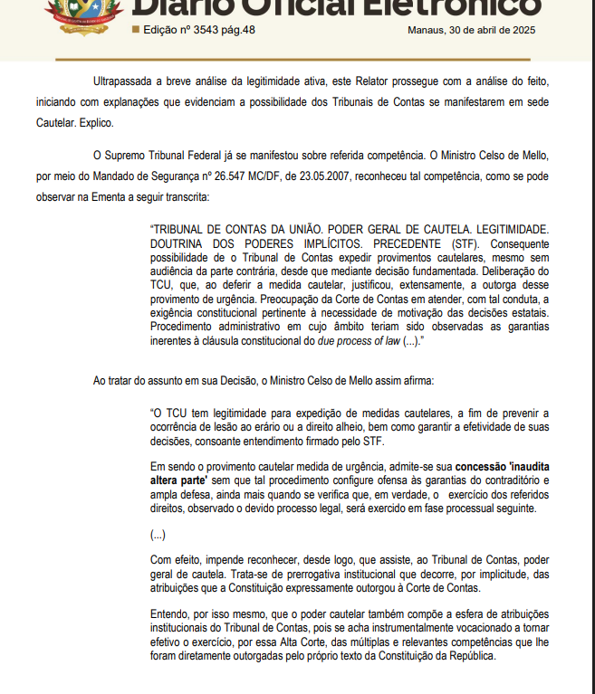 Apesar da gravidade dos fatos apontados, o relator do caso no TCE-AM decidiu, em despacho publicado no Diário Oficial Eletrônico do órgão (edição nº 3543), que ainda não é possível afirmar, de imediato, a necessidade da medida cautelar. Para o relator, não há provas suficientes que comprovem, de forma robusta, as alegações feitas pelo denunciante.