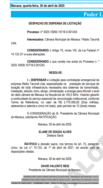 A Câmara Municipal de Manaus (CMM) firmou contrato no valor de R$ 2.775.000,00 com a empresa Rádio Tarumã Ltda por meio de uma dispensa de licitação classificada como “emergencial”. O acordo, com validade de 12 meses, foi formalizado no dia 30 de abril de 2025 e ratificado no mesmo dia pelo presidente da Casa Legislativa, vereador David Valente Reis (Avante). O documento foi publicado no Diário Oficial da Câmara.