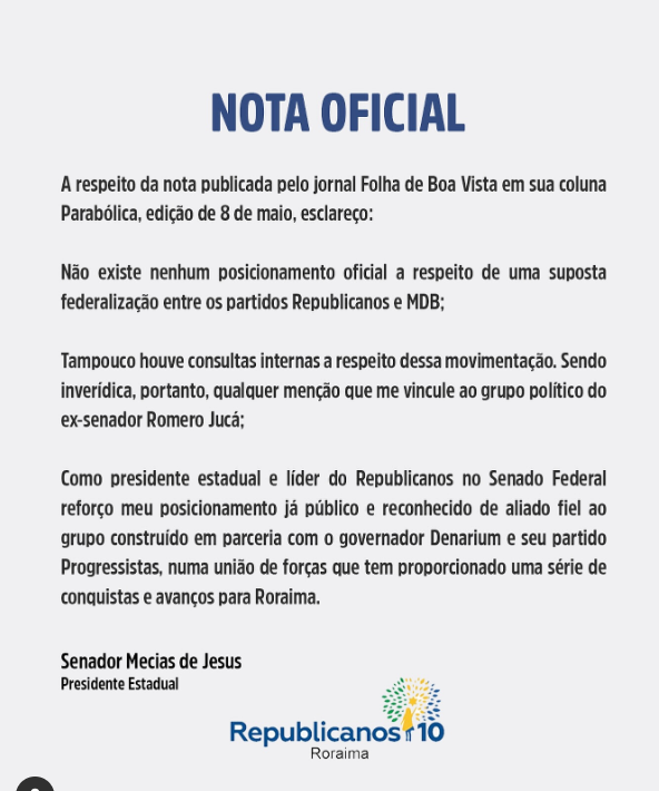 O presidente estadual do Republicanos em Roraima, senador Mecias de Jesus, divulgou uma nota oficial nesta quinta-feira (8) para desmentir informações publicadas pelo jornal Folha de Boa Vista, na coluna Parabólica, sobre uma suposta federalização entre os partidos Republicanos e MDB.