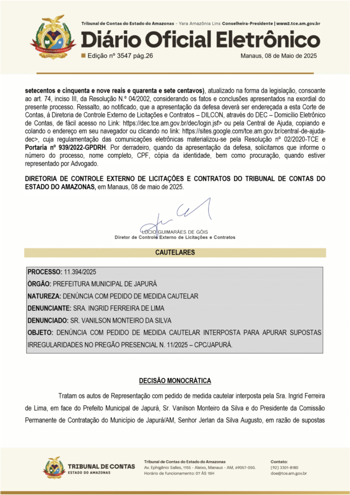 Entre os denunciados estão o prefeito Vanilson Monteiro da Silva e o presidente da Comissão Permanente de Contratação (CPC) de Japurá, Jerlan da Silva Augusto. A denúncia foi registrada na Diretoria de Controle Externo de Licitações e Contratos (DILCON) da Corte de Contas e resultou em uma decisão monocrática publicada no Diário Oficial Eletrônico do TCE-AM, edição nº 3.547, de 8 de maio de 2025.