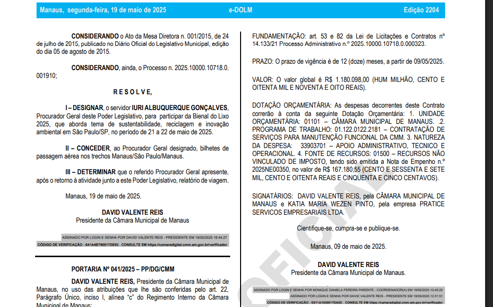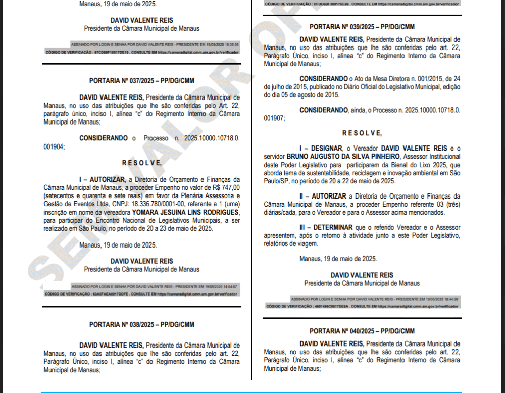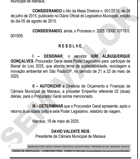 A Câmara Municipal de Manaus (CMM) autorizou a viagem de quatro representantes a São Paulo nesta semana para participação em dois eventos diferentes, mas com datas e locais coincidentes. Os compromissos ocorrem entre os dias 20 e 23 de maio e envolvem o vereador e presidente da Casa, David Reis (Avante), o servidor Bruno Augusto da Silva Pinheiro, o procurador-geral Iuri Albuquerque Gonçalves e a vereadora Yomara Lins (Podemos).