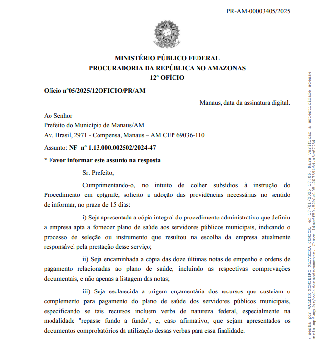 Além disso, a denúncia ao MPF questiona a homologação do Pregão Eletrônico nº 002/2024 – CML/PM e a convocação da empresa Hapvida Assistência Médica Ltda. para assinatura de contrato no valor de R$ 108 milhões, voltado à prestação de serviços de assistência médica e odontológica aos servidores municipais. O autor da denúncia pede a suspensão do contrato até que se comprove a regularidade dos recursos.