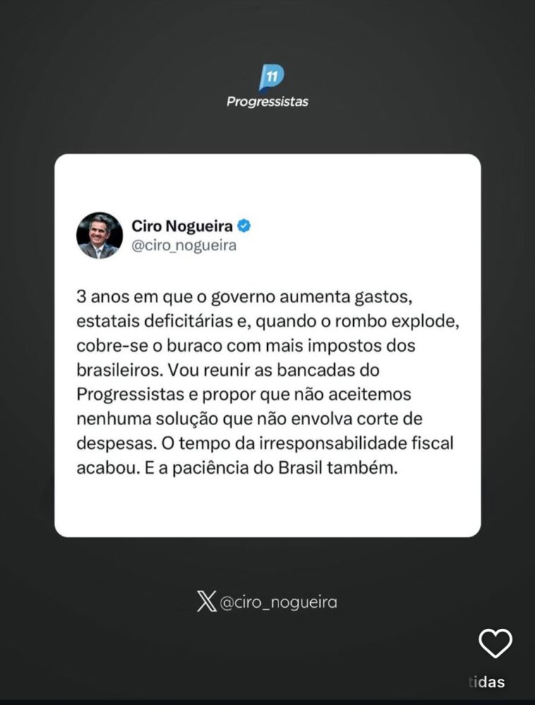 Em publicação nas redes sociais, Nogueira afirmou que há três anos o governo tem ampliado os gastos e mantido estatais deficitárias, o que, segundo ele, agrava o desequilíbrio das contas públicas. “Quando o rombo explode, cobre-se o buraco com mais impostos dos brasileiros”, escreveu.