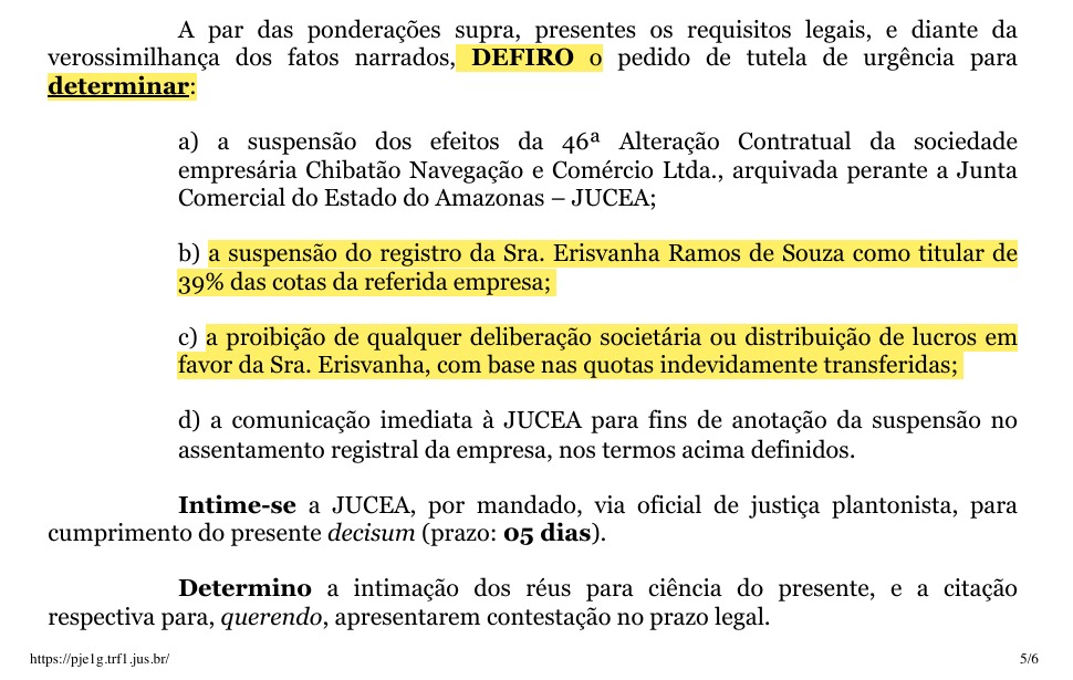 Durante a vigência do casamento e antes do falecimento de “Passarão”, Erisvanha teria articulado uma manobra jurídica classificada como “meação antecipada” para transferir 39% das cotas sociais da empresa Chibatão Navegação e Comércio Ltda. para seu nome. Essa alteração, registrada em julho de 2020, foi considerada à margem da legalidade.