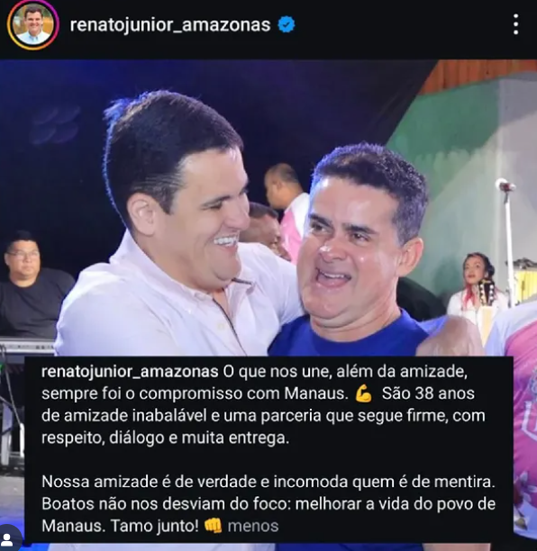 Em meio aos rumores de desgaste na relação, Renato Júnior publicou em suas redes sociais uma foto ao lado de David Almeida e afirmou que a amizade entre os dois permanece sólida. “Boatos não nos desviam do foco: melhorar a vida do povo de Manaus. Tamo junto!”, escreveu o vice-prefeito.