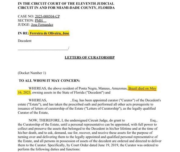 Segundo a ordem judicial, a nomeação se deu porque houve um “atraso injustificado” na definição de um representante legal qualificado para o espólio na Flórida — situação que pode ter colocado o patrimônio do falecido em risco. Segundo documentos obtidos, a justiça impõe controle total sobre bens nos EUA.