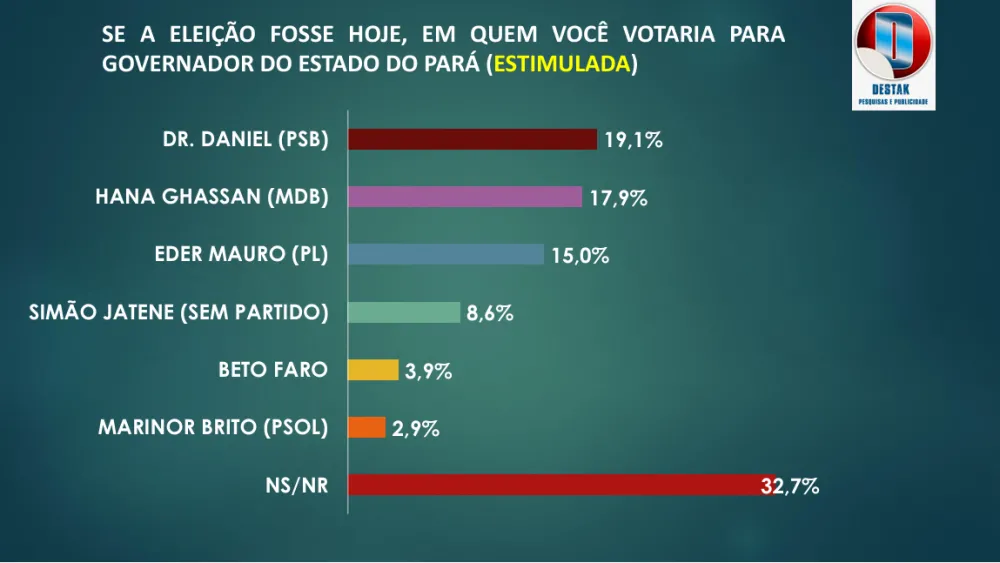 No cenário estimulado — quando os nomes são apresentados — Dr. Daniel lidera com 19,1% das intenções de voto, seguido de perto por Hana Ghassan, com 17,9%, e Éder Mauro, com 15%. Simão Jatene aparece com 8,6%, Beto Faro com 3,9% e Marinor Brito com 2,9%. Um percentual significativo, 32,7%, ainda não sabe em quem votar ou preferiu não responder.