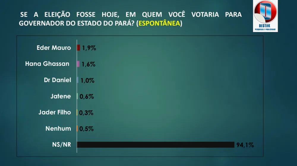 Na sondagem espontânea, em que os nomes dos pré-candidatos não são sugeridos, 94,1% dos entrevistados disseram não saber ou preferiram não responder. As menções mais citadas foram Éder Mauro (PL), com 1,9%; Hana Ghassan (MDB), com 1,6%; Dr. Daniel, com 1%; e Simão Jatene, com 0,6%. Outros nomes, como Jader Filho, foram lembrados por 0,3% dos participantes.