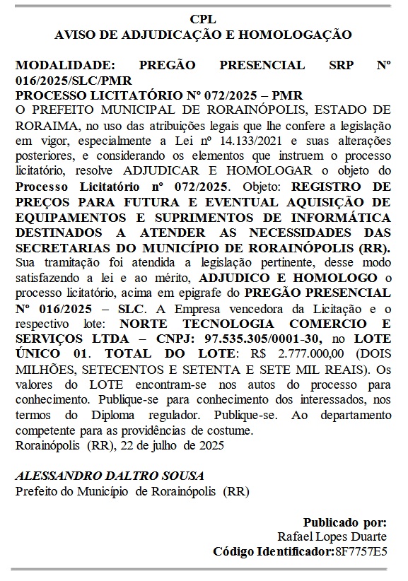 A Prefeitura de Rorainópolis, no sul de Roraima, homologou um contrato no valor de R$ 2.777.000,00 para aquisição de equipamentos e suprimentos de informática destinados às secretarias municipais. A empresa contratada é a Norte Tecnologia Comércio e Serviços Ltda, sediada na capital, Boa Vista.