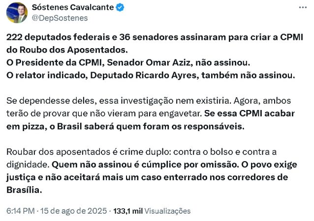 “Roubar dos aposentados é crime duplo: contra o bolso e contra a dignidade. Quem não assinou é cúmplice por omissão. O povo exige justiça e não aceitará mais um caso enterrado nos corredores de Brasília”, disse o deputado.