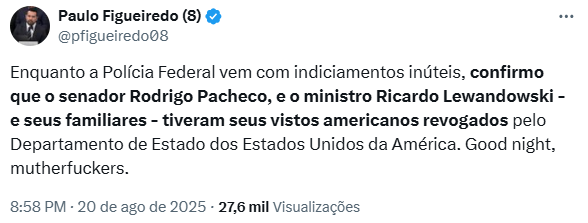 Segundo Figueiredo, a medida também se aplica aos familiares de ambos. Em postagem nas redes sociais, o jornalista afirmou: “Enquanto a Polícia Federal vem com indiciamentos inúteis, confirmo que o senador Rodrigo Pacheco e o ministro Ricardo Lewandowski – e seus familiares – tiveram seus vistos americanos revogados pelo Departamento de Estado dos Estados Unidos da América”.