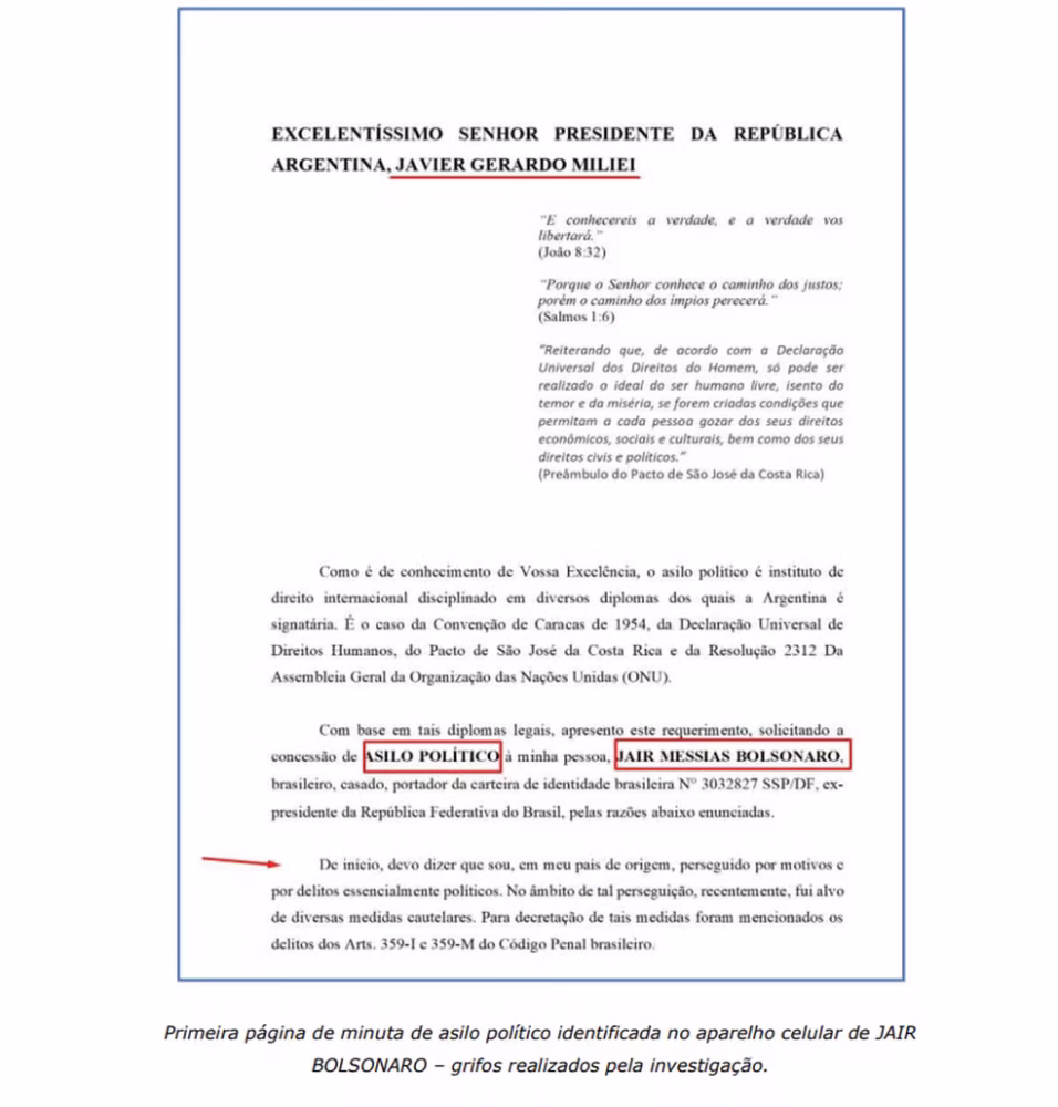 Durante a investigação, a PF também encontrou no celular de Bolsonaro um rascunho de 33 páginas com um pedido de asilo político ao presidente da Argentina, Javier Milei. O documento, datado de fevereiro de 2024, foi interpretado pelos investigadores como indício de planejamento de fuga para evitar a aplicação da lei penal. A defesa, no entanto, negou a intenção e afirmou que se tratou apenas de uma sugestão recebida pelo ex-presidente, posteriormente descartada.