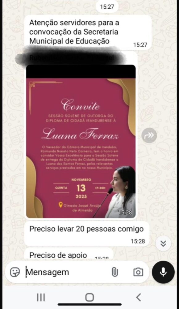 De acordo com relatos obtidos pela reportagem, gestores de escolas municipais estariam repassando mensagens em grupos de servidores convocando os funcionários a participar da solenidade e levar até 20 pessoas cada um, com o objetivo de “fazer número” e demonstrar apoio político à homenageada, apontada como pré-candidata a deputada estadual.