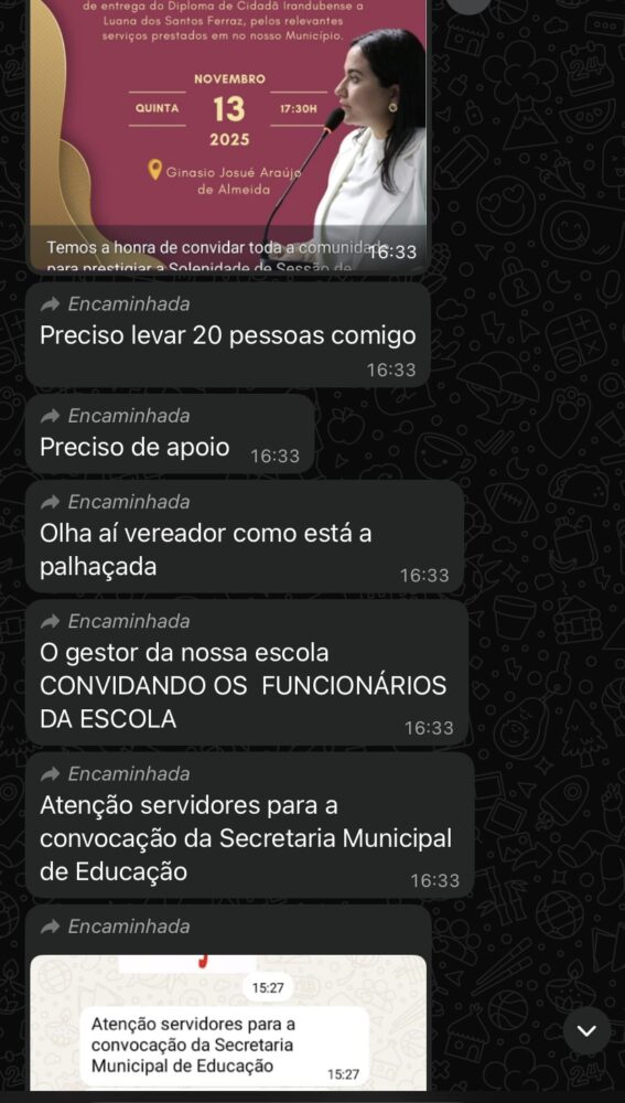 De acordo com relatos obtidos pela reportagem, gestores de escolas municipais estariam repassando mensagens em grupos de servidores convocando os funcionários a participar da solenidade e levar até 20 pessoas cada um, com o objetivo de “fazer número” e demonstrar apoio político à homenageada, apontada como pré-candidata a deputada estadual.