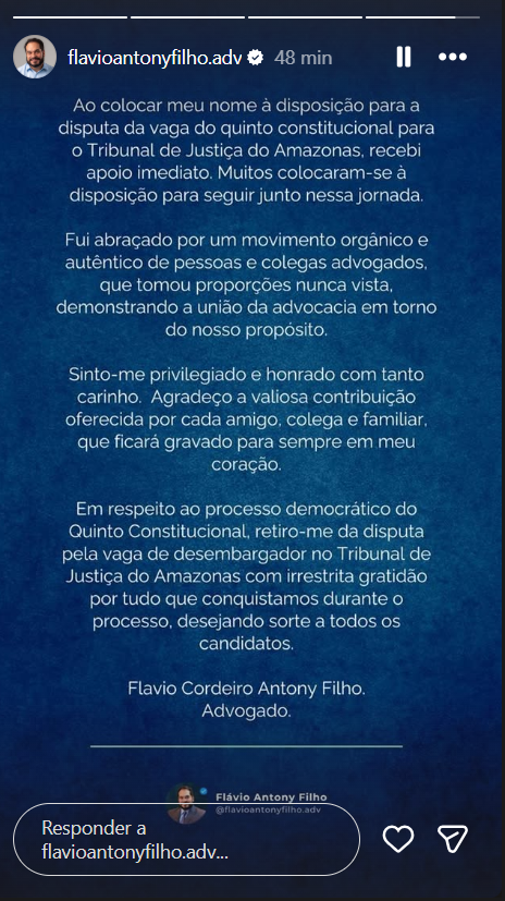 “Em respeito ao processo democrático do Quinto Constitucional e à instância que conduz essa escolha tão relevante para a advocacia amazonense, retiro-me da disputa pela vaga de desembargador do Tribunal de Justiça do Amazonas”, diz o texto assinado por Flávio Antony.