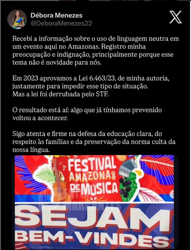 Antes mesmo da manifestação do governador Wilson Lima, a deputada estadual Débora Menezes (PL) já havia repercutido o caso nas redes sociais. Ela publicou a foto do evento em que aparece a expressão “Sejam bem-vindes”, destacando que o uso de linguagem neutra segue sendo alvo de debate no estado. A parlamentar lembrou que, em 2023, a Assembleia Legislativa do Amazonas aprovou a Lei 6.463/23, que vedava o emprego desse tipo de grafia em documentos oficiais, mas a norma acabou sendo invalidada posteriormente por decisão do Supremo Tribunal Federal (STF).