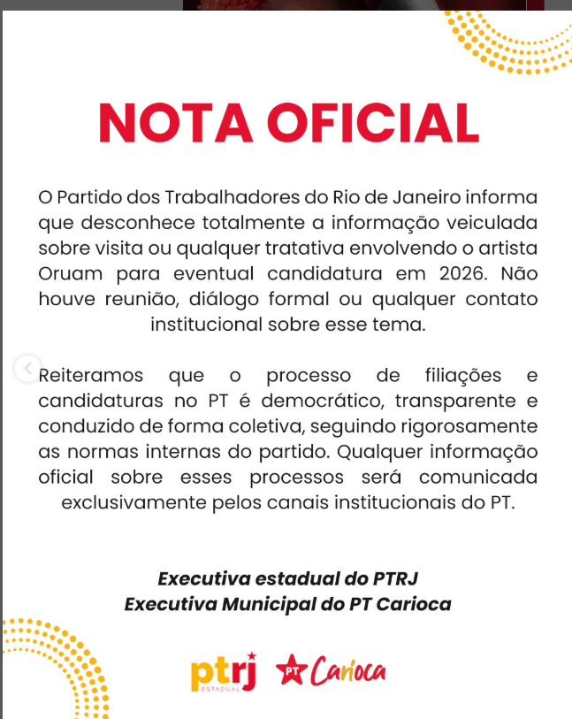 Os boatos ganharam força após o portal MD News afirmar que integrantes da equipe de Oruam teriam se reunido com dirigentes do PT para discutir uma eventual pré-candidatura do artista. A sigla, no entanto, chamou a divulgação de “narrativa falsa” e repudiou qualquer tentativa de associar o partido ao cantor.