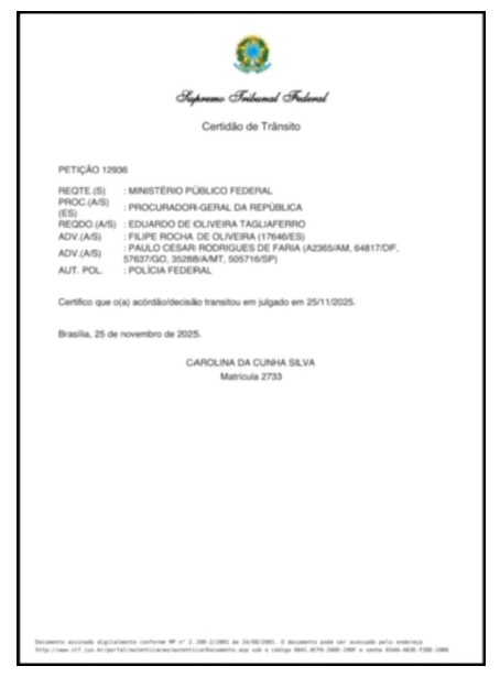 O ex-assessor afirma que, após a publicação, o documento foi retirado rapidamente. Em declaração divulgada nas redes sociais, Tagliaferro destacou: “STF publica por engano a certidão do trânsito em julgado em meu processo, mesmo antes de iniciar a defesa; removeram logo em seguida. Isso mostra a manipulação e a parcialidade, uma Corte que já tem a sentença condenatória pronta”.
