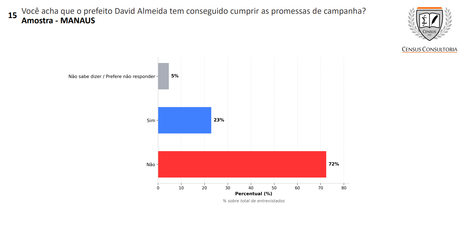 Outro ponto sensível identificado pela Census é a percepção de que o prefeito não entrega o que promete. Quando questionados sobre o cumprimento das propostas de campanha, 72% dos entrevistados respondeu que David Almeida não tem alcançado os compromissos assumidos.