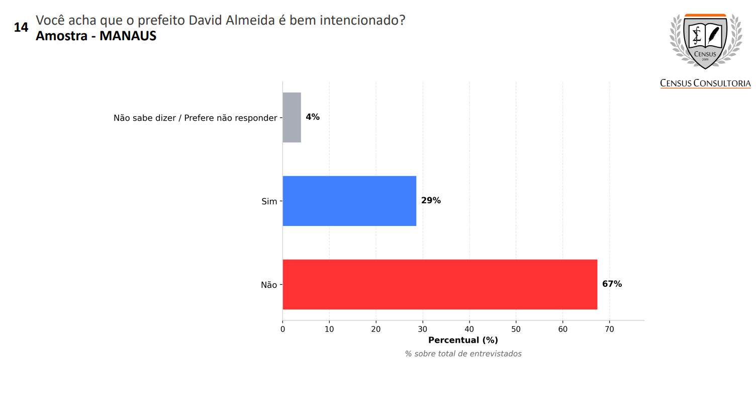 O grau de confiança no prefeito também é motivo de preocupação. Ao avaliar se David Almeida é “bem intencionado” em suas decisões e ações, 67% dos eleitores mostraram alto nível de desconfiança. Quanto ao caminho do prefeito 66% dos entrevistados disseram que David está no caminho errado.
