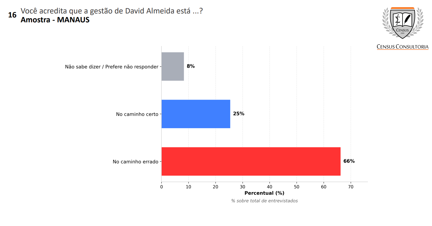 O estudo ouviu 2 mil eleitores do Amazonas entre os dias 1º e 4 de dezembro, por telefone, e aponta que a imagem de David Almeida vem se deteriorando tanto na avaliação da administração quanto em percepções subjetivas sobre sua atuação. 63% dos entrevistados desaprovam a gestão municipal de David Almeida.