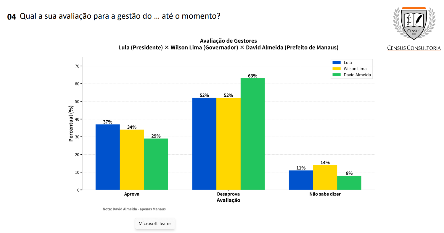 Os números negativos aparecem de forma consistente. A pesquisa comparou o desempenho de David Almeida com o de Lula e Wilson Lima, mostrando que o prefeito lidera a taxa de desaprovação entre os três.