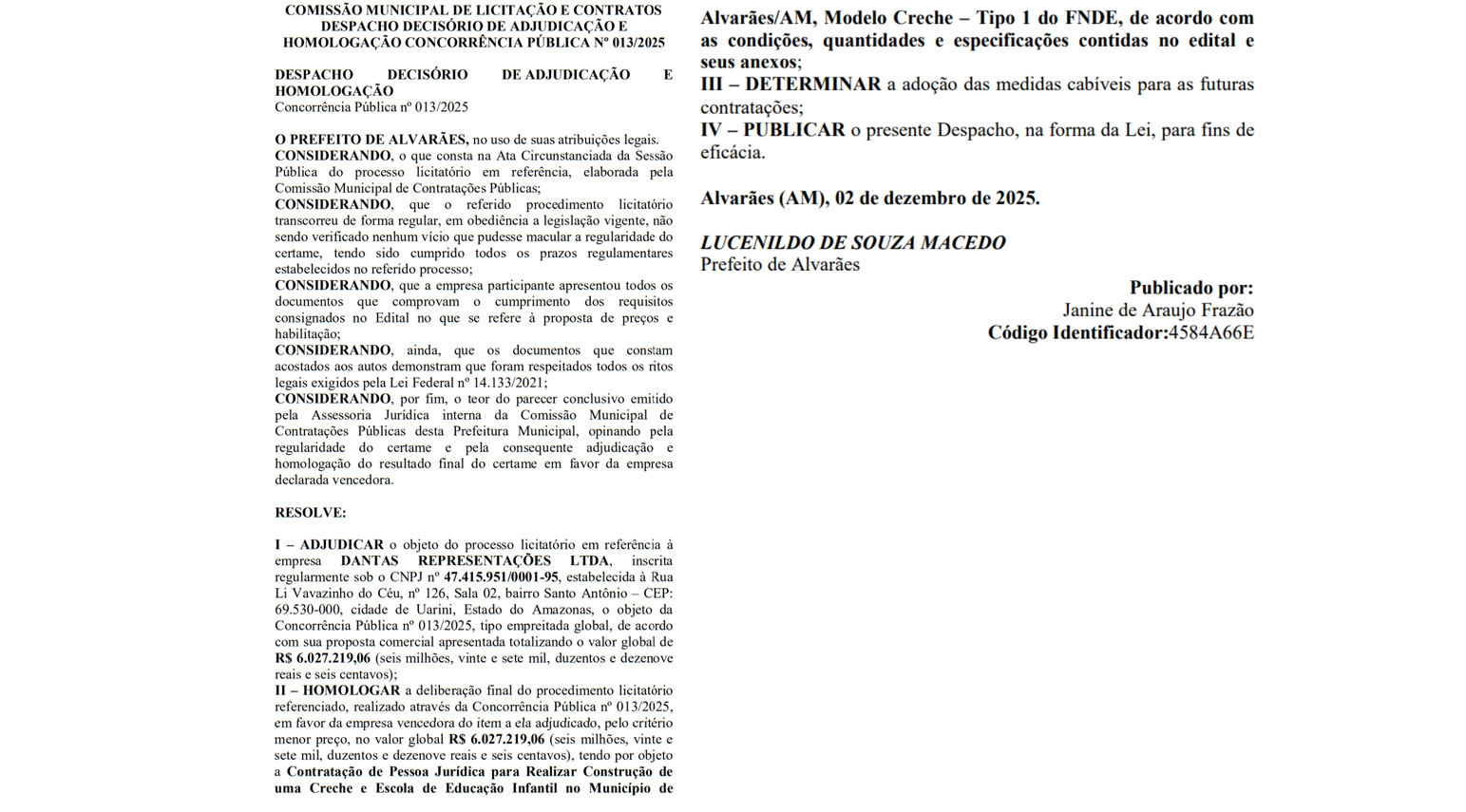 O prefeito de Alvarães, Lucenildo de Souza (União Brasil), firmou um contrato no valor de mais de R$ 6 milhões com uma empresa de perfil comercial para a construção de uma creche e uma escola infantil no município. A contratação foi publicada no Diário Oficial dos Municípios do Amazonas na última quarta-feira (24), véspera de Natal.