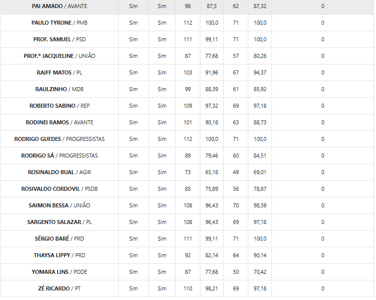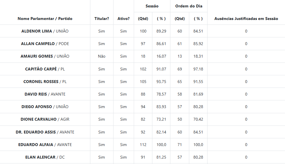 Por outro lado, o relatório também aponta casos de frequência abaixo da média. Yomara Lins (Podemos) e Dione Carvalho (Agir) registraram índices inferiores a 75% de presença nas sessões plenárias ao longo de 2025.