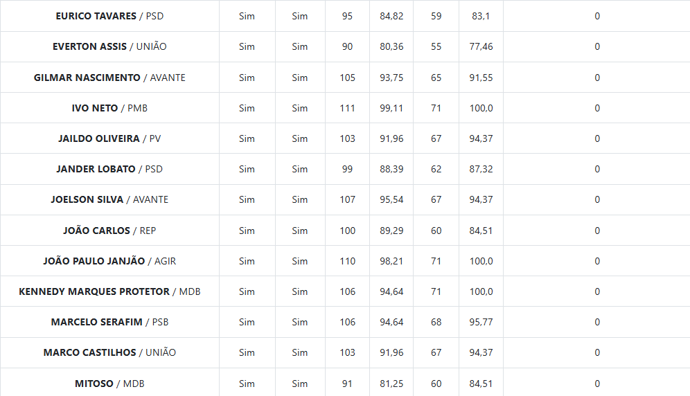 Entre os vereadores com desempenho de destaque estão Eduardo Alfaia (Avante), Paulo Tyrone (PMB) e Rodrigo Guedes (Progressistas), que compareceram a todas as sessões e votações realizadas ao longo do ano, alcançando 100% de presença.