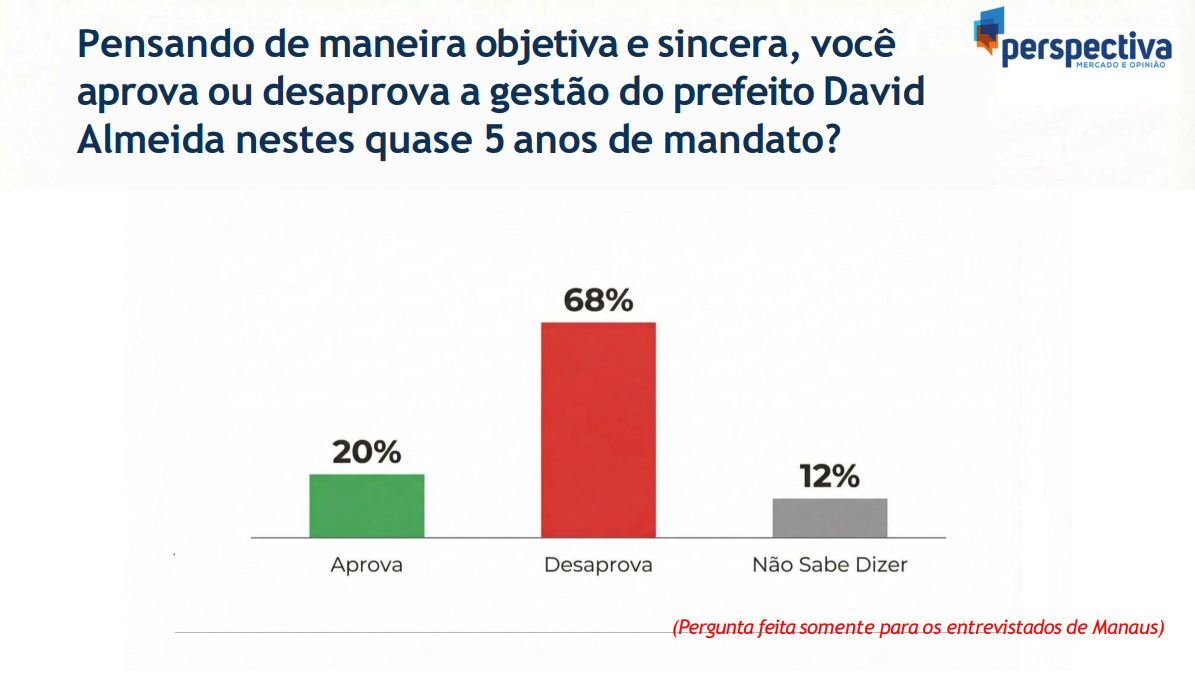 Um levantamento do instituto Perspectiva Mercado & Opinião revela que a administração do prefeito de Manaus, David Almeida (Avante), enfrenta alto índice de rejeição entre os moradores da capital. A pesquisa, divulgada no domingo (28), mostra que 68% dos entrevistados desaprovam a condução do governo municipal.