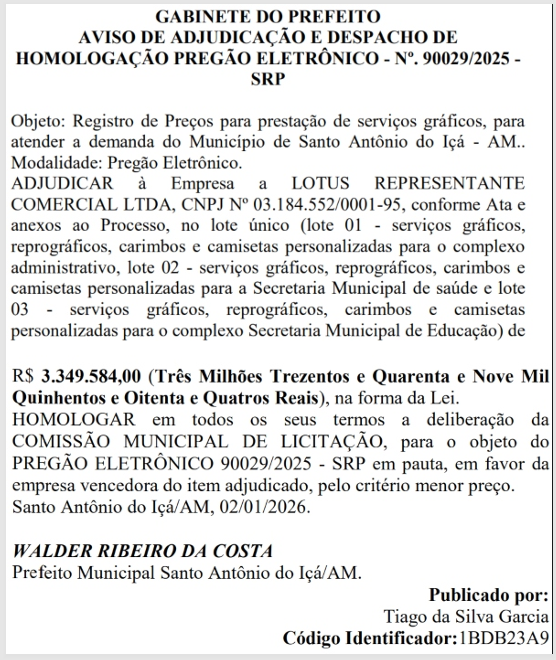A Prefeitura de Santo Antônio do Içá, firmou um contrato no valor de R$ 3,3 milhões para a contratação de serviços gráficos, incluindo a produção de carimbos e camisetas personalizadas. O acordo foi assinado pela gestão do prefeito Walder Costa, conhecido como Cecéu (MDB), e publicado no Diário Oficial dos Municípios na última sexta-feira (2).
