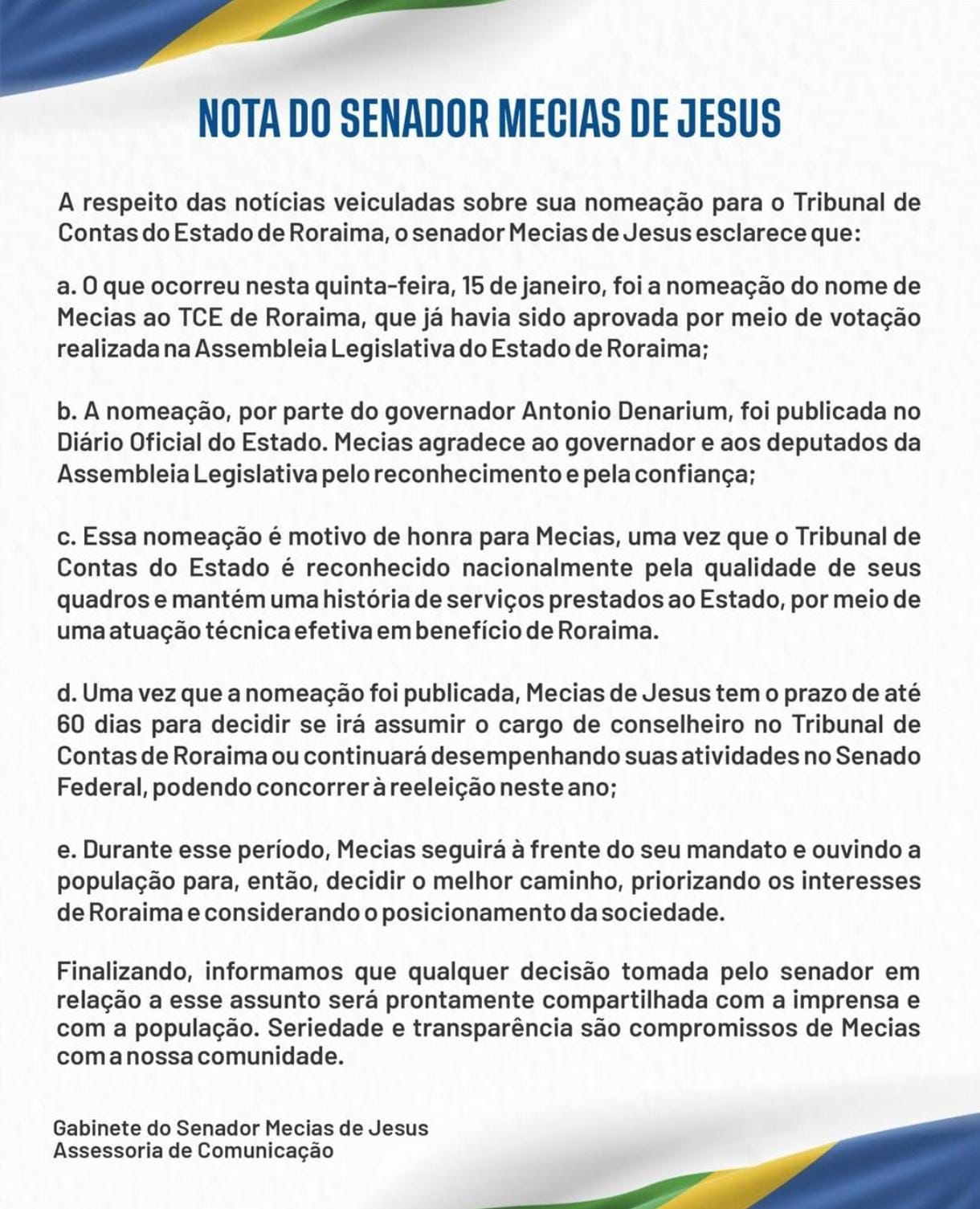 Durante esse período, o senador assegurou que seguirá exercendo normalmente o mandato no Senado, mantendo como prioridade os interesses de Roraima. Na nota, Mecias agradeceu ao governador e aos deputados estaduais pela confiança e classificou a indicação ao TCE como uma honra, destacando o reconhecimento nacional do tribunal pela atuação técnica e pelo compromisso com a gestão pública.