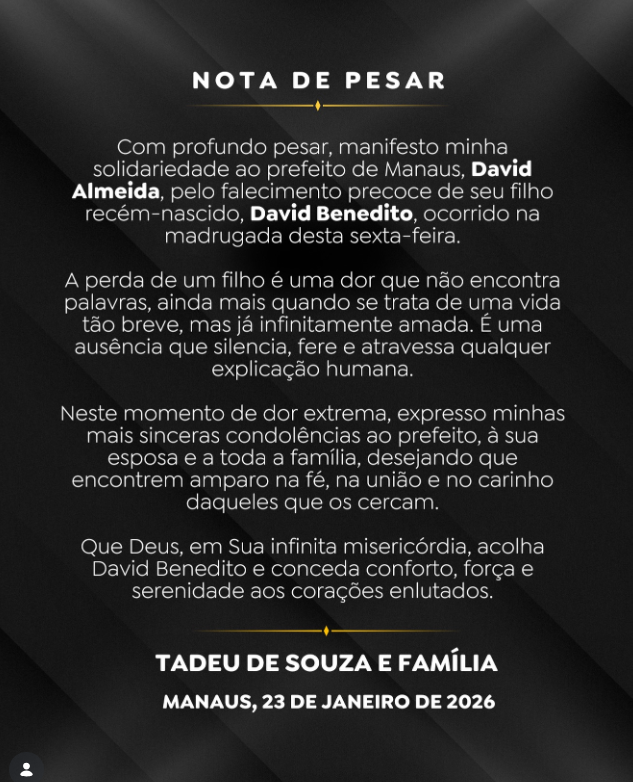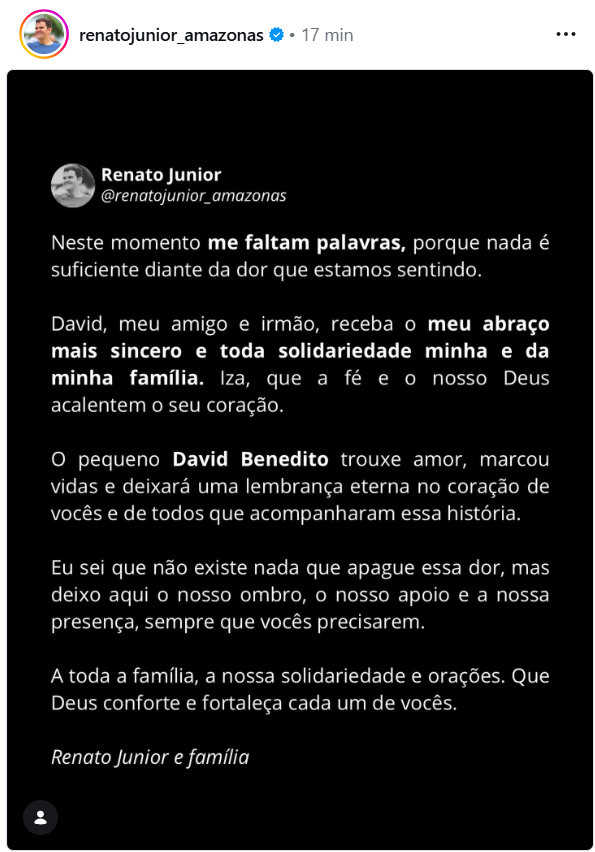 O vice-prefeito de Manaus, Renato Junior, adotou um tom pessoal e emocionado ao se solidarizar com o prefeito e a primeira-dama. Em mensagem pública, afirmou que faltam palavras diante da dor e reforçou o vínculo de amizade com David Almeida. Renato destacou que, apesar da breve passagem, o pequeno David Benedito deixou marcas de amor e uma lembrança eterna, colocando-se à disposição da família para oferecer apoio e presença neste momento delicado.