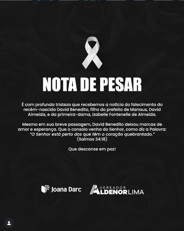 A morte de David Benedito, filho do prefeito de Manaus, David Almeida, e da primeira-dama Izabelle Fontenelle, provocou uma ampla comoção e mobilizou manifestações de solidariedade de autoridades políticas do Amazonas. O bebê faleceu na madrugada desta sexta-feira (23), aos 20 dias de vida, e desde então mensagens de apoio à família têm sido divulgadas nas redes sociais.