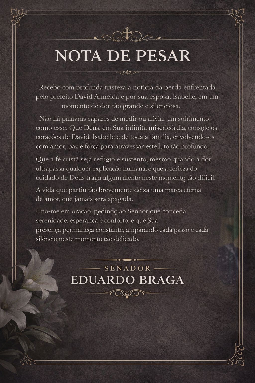 O senador Eduardo Braga (MDB) afirmou ter recebido a notícia com “profunda tristeza” e destacou que não existem palavras capazes de dimensionar ou amenizar uma dor dessa natureza. Em sua manifestação, o parlamentar desejou que Deus conceda consolo, paz e força ao prefeito, à esposa e aos familiares, ressaltando a fé cristã como refúgio diante de um sofrimento que ultrapassa qualquer explicação humana.