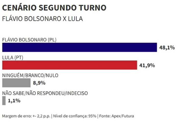 A pesquisa também avaliou um eventual segundo turno entre Lula e Flávio Bolsonaro. Nesse confronto direto, o senador venceria com 48,1%, enquanto o presidente aparece com 41,9%. Outros 8,9% declararam voto branco, nulo ou em nenhum dos dois, e 1,1% não souberam ou preferiram não responder.
