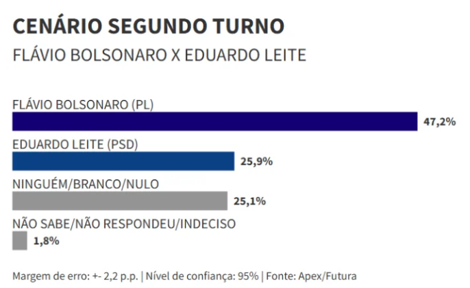 A maior vantagem de Flávio Bolsonaro ocorre no cenário 6, no qual o senador registra 43,8% das intenções de voto, contra 38,7% de Lula. A diferença supera a margem de erro, afastando a possibilidade de empate técnico. Nesse cenário, também aparecem o governador Eduardo Leite (PSD), com 4,2%, e Renan Santos (Missão), ligado ao MBL, com 2,8%. Brancos, nulos e indecisos somam 10,4%.