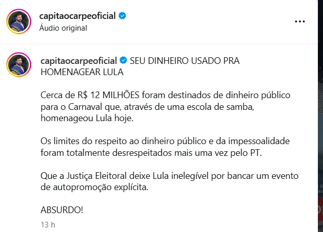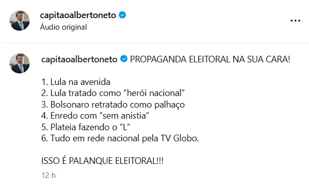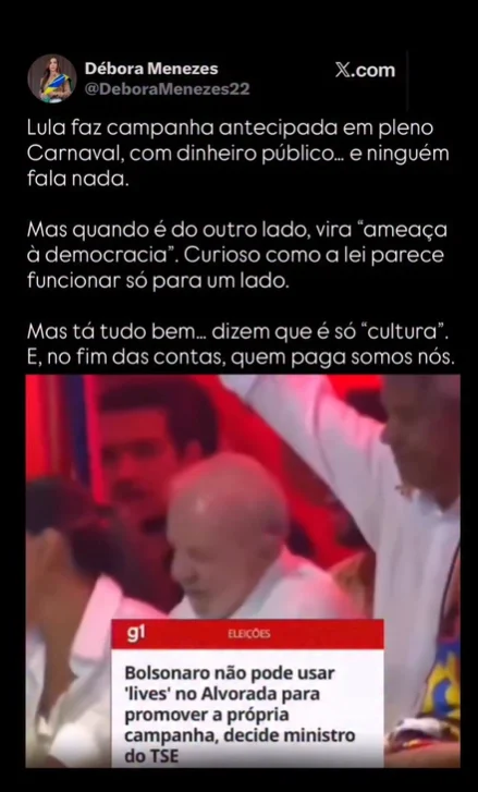 Até o momento, não há decisão judicial que enquadre a homenagem como propaganda eleitoral irregular. O episódio, no entanto, reforça o clima de polarização política e evidencia como o embate entre governo e oposição tem alcançado também eventos culturais de grande visibilidade nacional, como o Carnaval.